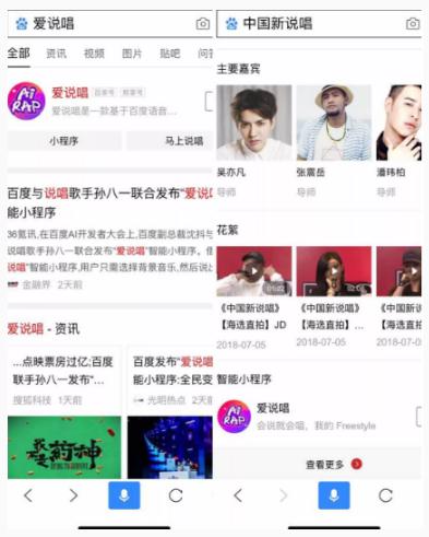 以爱说唱智能小程序为例,在百度搜索里直接搜「爱说唱」,会在结果页最上方呈现智能小程序;如果搜索一档说唱相关综艺节目「中国新说唱」,结果栏也会出现「爱说唱」智能小程序。再以携程小程序为例,只要用户近期存在针对旅游资讯的搜索行为,并且关注了推送旅游攻略与优惠信息的百家号,携程智能小程序就会自动被推送出现在手机百度 feed 流推荐之中,从而达到唤醒用户的目的。不论是哪种方式,从中都可以窥见百度试图盘活存量搜索数据、打通内容——信息——服务最优链路的愿景与初心。