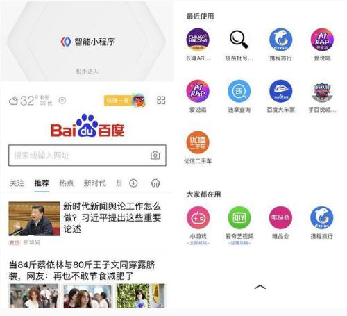 虽然百度版的智能小程序仅仅推出了两月有余,百度小程序在更新迭代上,从未表现出丝毫的懈怠。现在用户可以直接从手机百度 APP 首页下拉调取进入小程序页面,虽然与微信的首页下拉采取了相同的调取方式,但是相较于微信的半屏展示,百度的全屏呈现显然使得小程序的排布更加符合视觉习惯,更加便于用户的查找与点击。