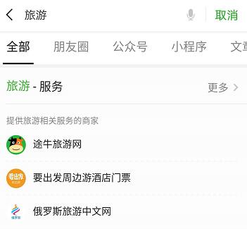 例如搜索“旅游”,则会出现于旅游相关的小程序服务: