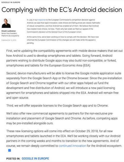 首先,我们正在更新与移动设备制造商的兼容性协议,其中包括如何应用 Android 系统开发智能手机和平板电脑。希望在未来,安卓系统配备的 Google apps 也可能为欧洲经济区(EEA)构建不兼容或分叉的智能手机和平板电脑。