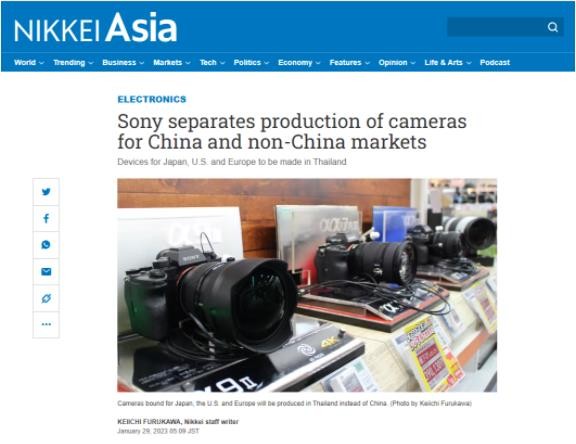 据日经新闻报道,索尼集团已将在日本、美国和欧洲市场销售的相机的生产从中国转移到泰国,目的是通过减少对中国的依赖来保护其供应链。