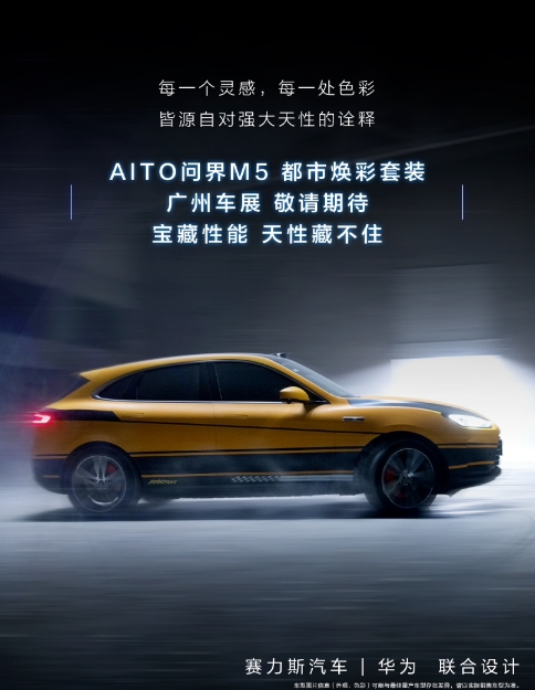 华为和赛力斯联合设计的 AITO 问界 M5 汽车今日公布了“都市焕彩套装”,将于广州车展正式发布。