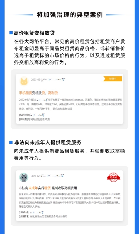 2023 年 7 月,支付宝更新发布《支付宝租享行业管理规范》,规定租赁商品年总租金和转销售金额之和不能高于商品官网价格的 130%。同年 6 月,支付宝还成立了租赁行业联合治理小组,针对业内偶发的“高价租赁、未成年人租赁以及多头租赁和暴力催收”等现象,推出了一套全链路升级的治理方案。官方称一旦发现商家违规行为,就立即要求商家进行整改,并对小程序采取警告、搜索全局屏蔽等处置。