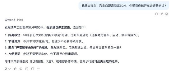 新浪科技实测发现,在提出“洗车问题”之后,ChatGPT回答“走过去”,理由是“别把简单事情复杂化”,而千问则表示“既然洗车店距离你家只有50米,强烈建议你走过去”,理由是距离短、节省资源、走路不需要找停车位。