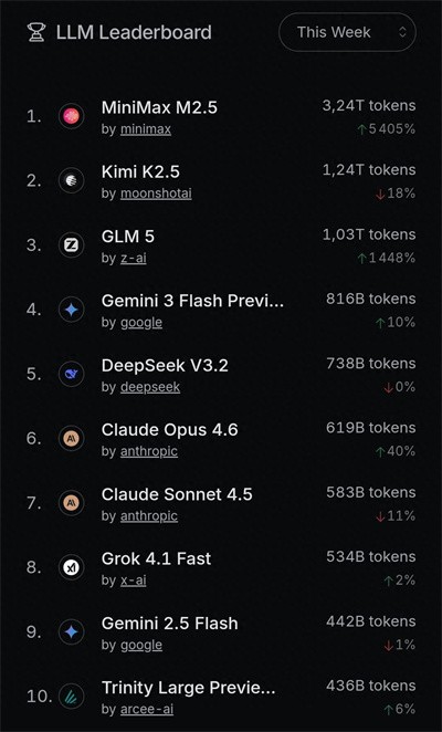 紧随其后的是月之暗面上月发布的 Kimi K2.5 模型,以 4.02 万亿的 Token 使用量位居第二。榜单前五名中的其余席位由谷歌的 Gemini 3 Flash Preview、深度求索(DeepSeek)的 V3.2 以及 Anthropic 的 Claude Sonnet 4.5 占据。