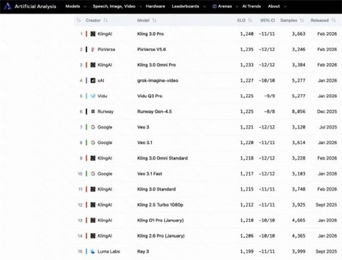 新浪科技讯 2月26日上午消息,全球知名AI基准测试机构Artificial Analysis近日发布最新的全球视频生成大模型榜单,可灵3.0系列模型(Kling 3.0 Pro)以1240的Arena ELO基准测试评分位居文生视频赛道第一位,在前15名中可灵共有7个模型在榜。
