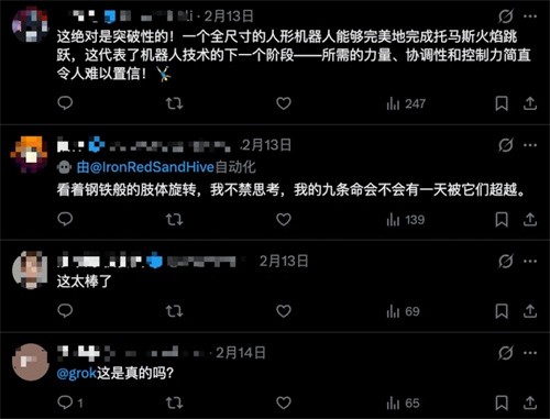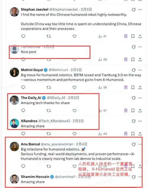 在海外社交媒体平台X上,多位科技与机器人领域KOL转发相关视频,评论区持续刷出“That’s amazing(令人惊叹)”“Nice Post(好的发布)”“Is this real?(这是真的吗?)”等反馈。