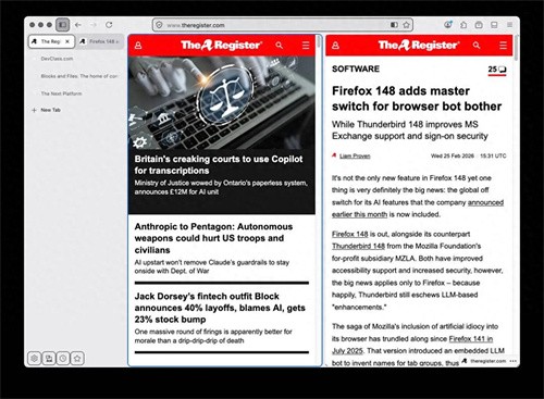 3 月 3 日消息,据科技媒体 The Register 昨天报道,火狐 Firefox 浏览器 149 Beta 版现已新增分栏浏览功能,能够让用户在同一个窗口中并排浏览两个网页,还能使用鼠标调整两者之间的比例,正式版有望 3 月 24 日发布。