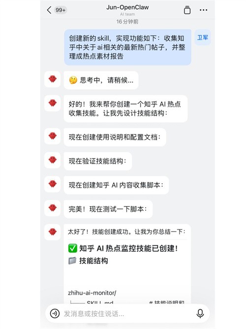 2、通过对话框聊天,发送自然语言指令,直接创建新的skill,因为openclaw内置了skill creator技能,能根据你的指令生成完整的skill。
