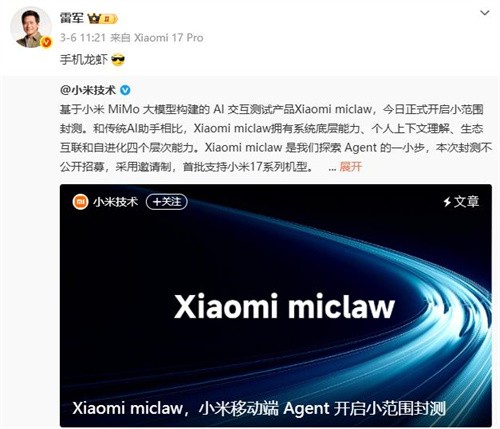 与此同时,终端设备厂商也快速行动。近日,小米公司推出基于自研大模型的AI交互测试产品“Xiaomi miclaw”,小米创办人、董事长兼CEO雷军在微博上称之为“手机龙虾”。