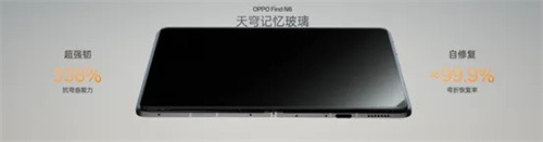 折痕问题长期以来是阻碍折叠屏手机普及的核心痛点。OPPO Find N6从结构与材料两个维度进行了革命性重构。在结构上,其搭载的“新一代钛合金天穹铰链”引入行业首创的仿生对称四轴结构,并结合芯片级高分子3D打印技术,将铰链中板平整度至高提升75%,支撑面起伏降至惊人的0.1mm以内。在材料上,全新研发的“天穹记忆玻璃”具备极强的抗弯曲形变能力,相比传统柔性玻璃提升338%,且拥有99.9%的形状自修复能力,展开后折痕可快速回弹淡化。