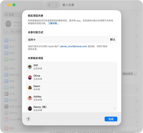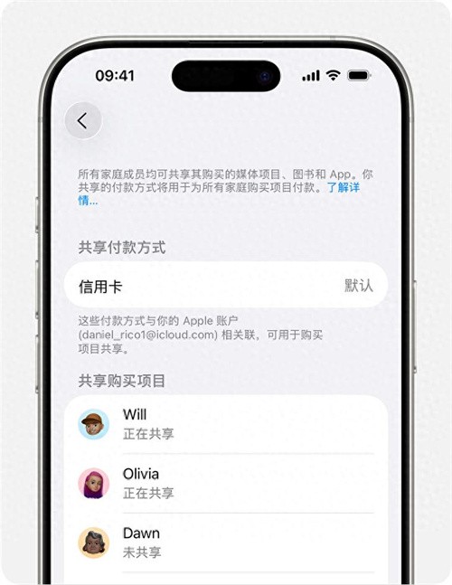 当家人共享组织者打开“购买项目共享”,并且群组中的其他家庭成员也打开“购买项目共享”时,他们可以访问彼此共享的内容,例如 App、音乐、影片等。家人共享组织者为每个人购买的项目付款,除非其关闭了“购买项目共享”。