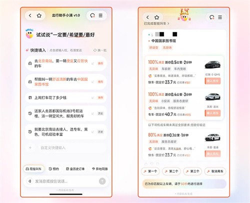 小滴还能做一些顺手的事,比如问它“附近哪家咖啡店近”,它能直接帮你一键叫车过去;远距离出行,让它给你推荐多种交通方式的换乘方案,还有“花式”查订单、预约叫车等。