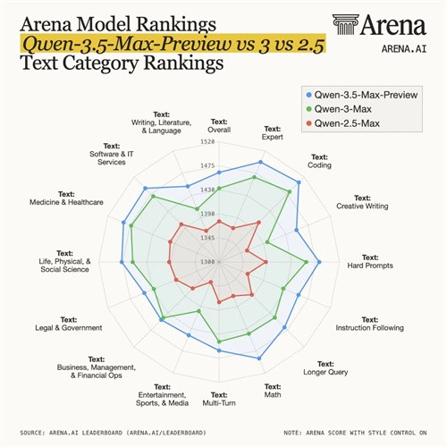 3 月 20 日消息,阿里千问大模型家族再迎新成员。今日,Qwen3.5-Max-Preview 作为千问 3.5 系列的旗舰模型预览版,在全球大模型竞技平台 LM Arena 正式亮相,并获得 1464 分的综合得分。