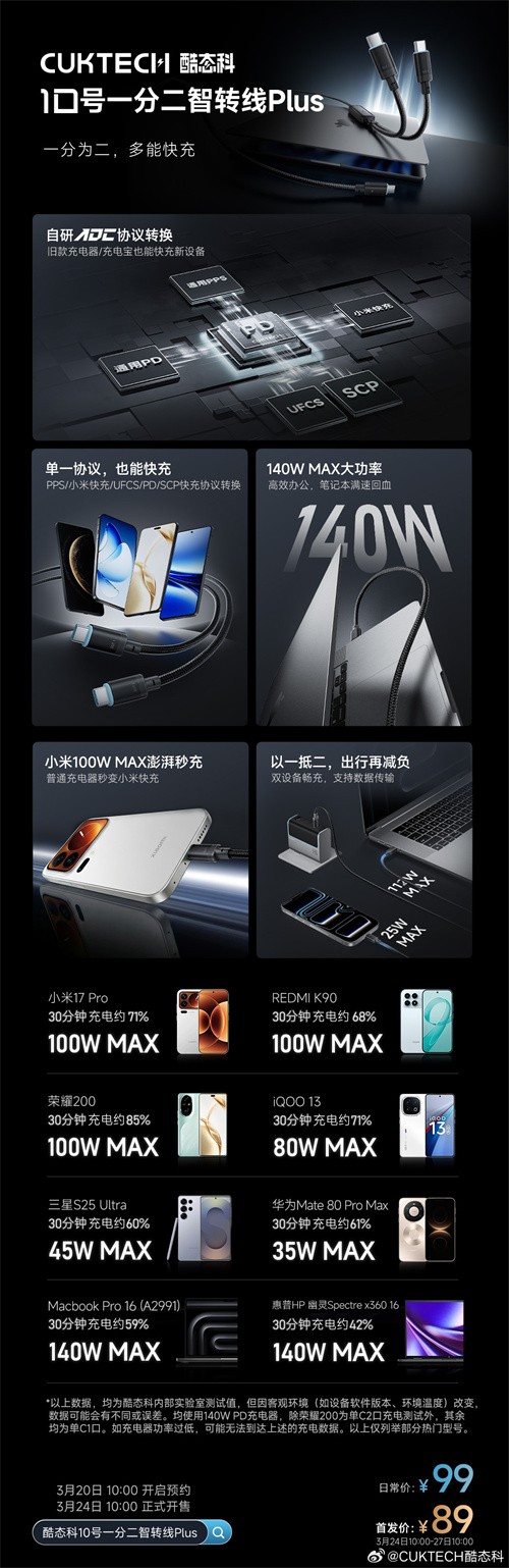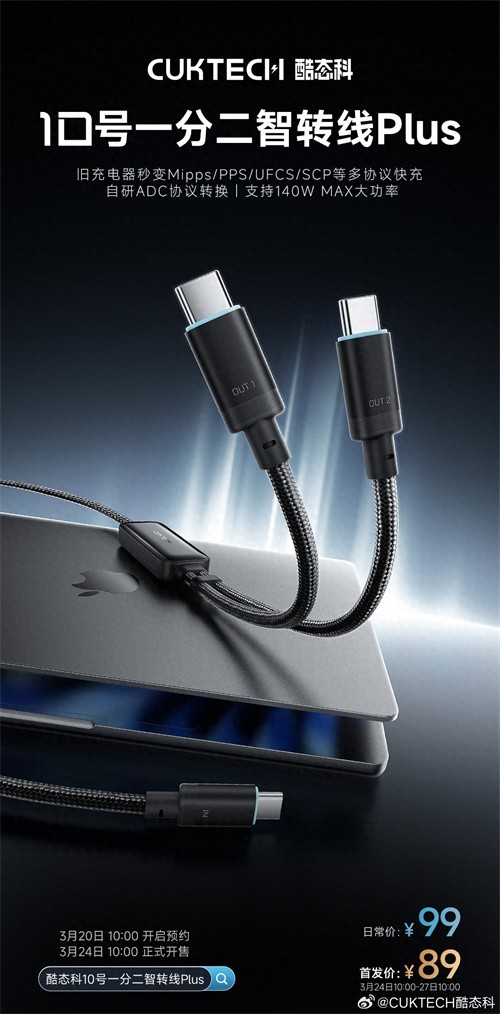 IT之家 3 月 20 日消息,酷态科官方今日宣布,酷态科 10 号一分二智转线 Plus 现已开启预约,采用苹果同款 48 锭编织线,3 月 24 日 10:00 正式开售,首发价 89 元(截至IT之家发稿暂未上架京东)。