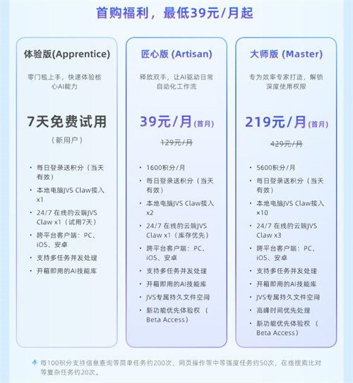 JVS Claw 为新用户提供了 7 天免费体验权益,同时新增“匠心版(Artisan)”和“大师版(Master)”套餐,其中“匠心版(Artisan)”月卡首月 39 元、后续 129 元 / 月。