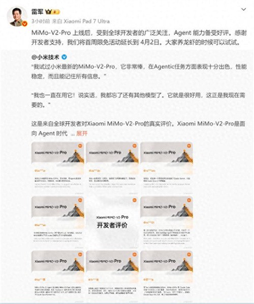 在AI大模型赛道打得火热的当下,小米的入局姿态显得异常凶猛。近日,雷军亲自下场发声,宣布小米面向Agent时代的旗舰基座模型——MiMo-V2-Pro自上线以来,在全球开发者圈层引发了热烈反响,其核心的Agent能力更是收获了一致好评。为回馈这份热情,雷军拍板决定:将原定的首周限免活动正式延长至4月2日,并幽默地喊话开发者:“大家‘养龙虾’(注:业内对AI Agent的趣味代称)的时候可以试试。”
