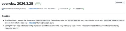 官方态度谨慎:从更新日志看,官方对破坏性变更保持了克制,仅清理了早已废弃的 Qwen 认证和极旧的配置格式。新增功能都放在插件层面或可选特性,不影响基础运行。