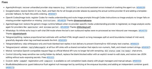 修复密度极高:3.22 的核心问题是插件系统重构导致大量兼容性断裂。而 3.28 版本中,官方显然把重点放在了 “让已经重构的架构稳定运行” 上。超过100项修复覆盖了 WhatsApp、Discord、Telegram、飞书、Matrix 等几乎所有主流渠道,以及 Agent 核心、记忆、工具调用等关键路径。这是典型的“稳定化发布”。