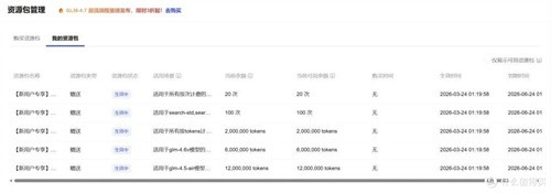 进页面右上角"财务 - 资源包"查额度明细。包含 600 万 Tokens 的 glm-4.6v、1200 万 Tokens 的 glm-4.5-air,另有 200 万通用 Tokens,还可以试 GLM-5-Turbo。