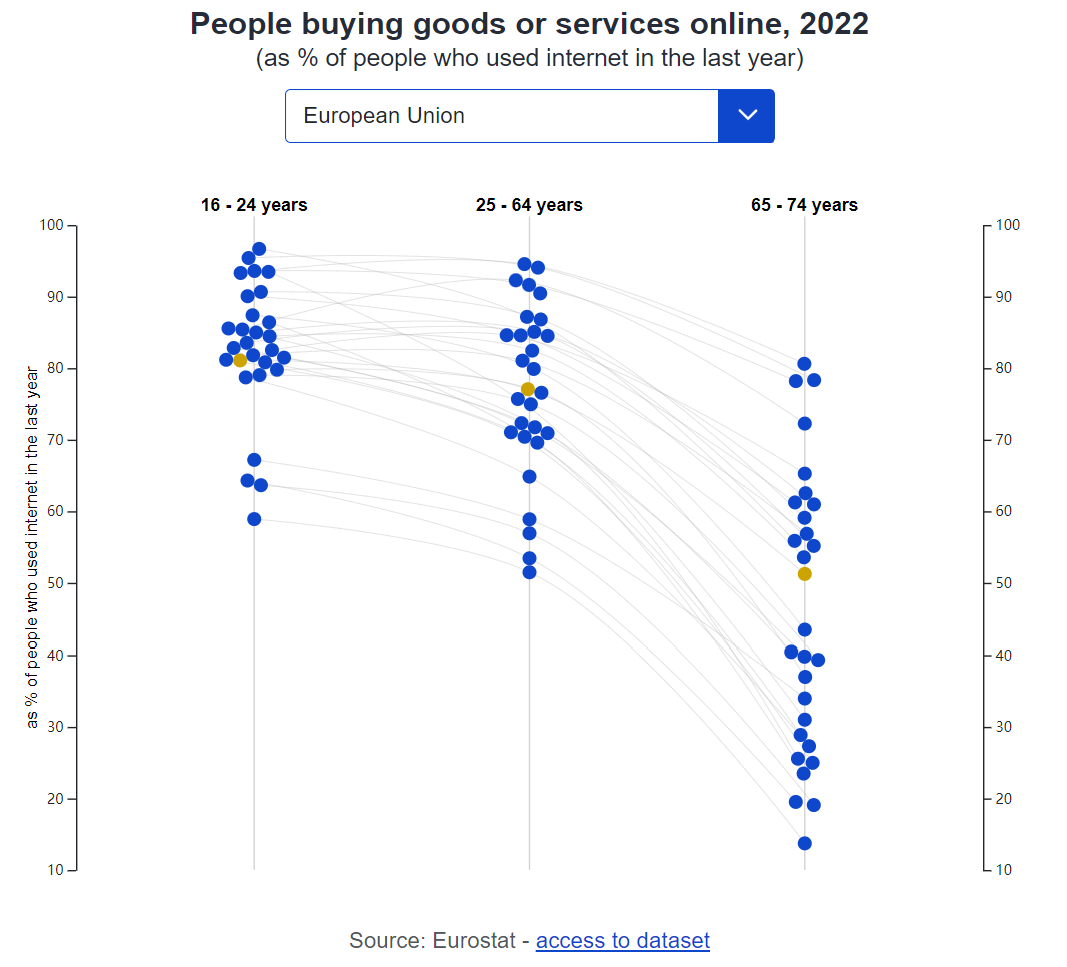 2022年,90%的欧盟人口报告说他们在过去3个月内使用过互联网。仔细研究一下他们在网上的行为就会发现,互联网主要用于与他人交流,例如
